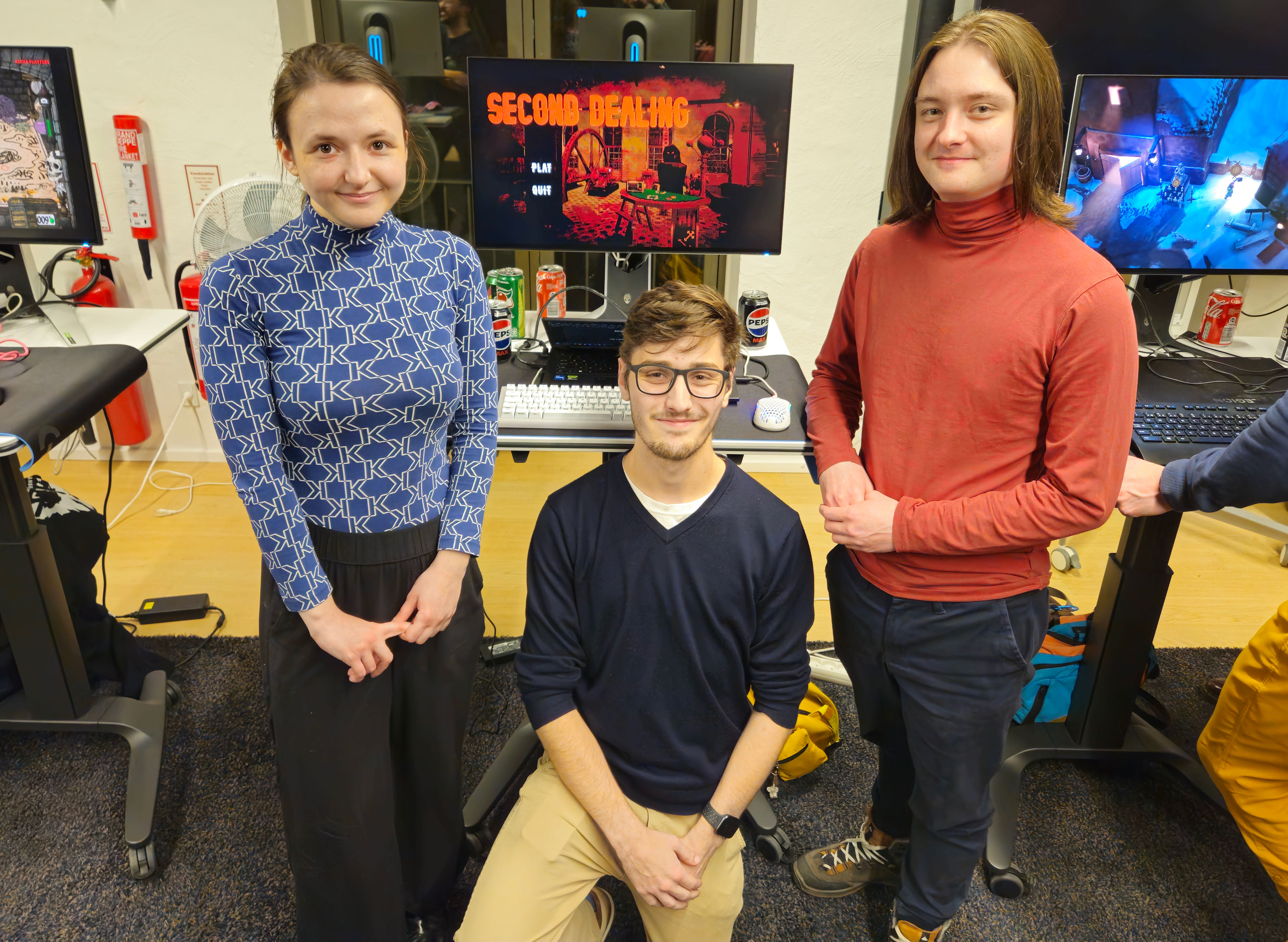 In front of me sits an omnious looking dealer in an oppressive room not dissimilar to Inscryption however the aesthetics and style are much more similar to games of old with low poly hands, dithering and visual artefacts. We are about to play some Blackjack, however if I lose all my money, I'm out. As in dead. Talking to the students who made it I was correct in assuming it's very inspired by Buckshot Roulette in which you play against a creepy monster dealer where every shot of the weapon could be a blank or it could kill you, similar to Russian Roulette. However what's also interesting is that with your pot you can buy items to help your chances at winning the next hand. For example a cross to ensure that your next hit is always perfect, a knife to slice the value of the dealer's hand in half or sunglasses to see the next hit. So there is always a risk reward consideration you need to make on whether you want to buy items to win big next time or if you should save the pot and keep going. I had a strategy of going all-in every time and in a couple of rounds I was at 52300 in the pot. They told me that I needed 100.000 to win and in the end luck wasn't on my side and I lost. Quite an interesting little game with lots of opportunities for expanding the scope and introducing cool twists and turns.